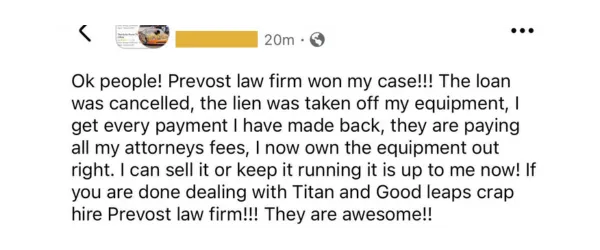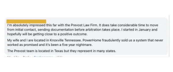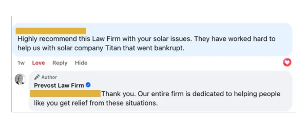 One client shared her story publicly, saying that Prevost Law Firm did an excellent job explaining her options and guiding her through her solar lawsuit. Another client, Tim Riker, discussed his experience after dealing with Titan Solar, describing how the firm “walked him through each step until his case reached a resolution.”