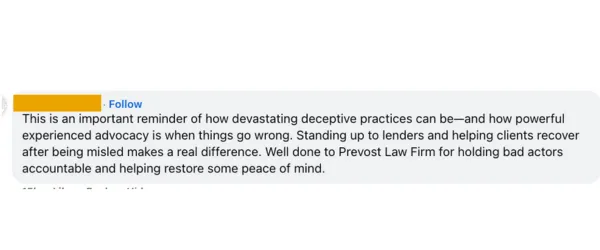To anyone dealing with a solar panel loan disaster: don’t wait—call Prevost Law Firm. They are incredible, and they truly fight for people like us. We are so grateful we found them, and we hope others in similar situations will reach out for their help.